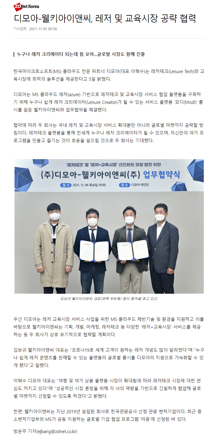 - [디모아] 지디넷코리아) 디모아-웰키아이앤씨, 레저 및 교육시장 공략 협력2021-11-05