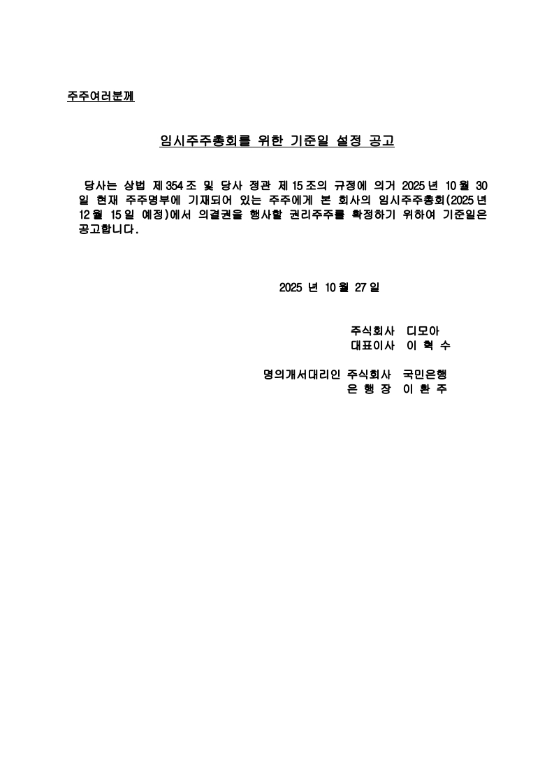 임시주주총회를 위한 기준일 설정 공고