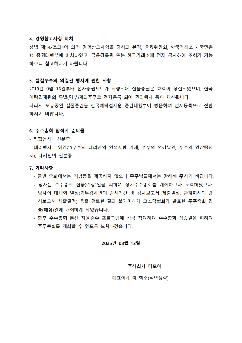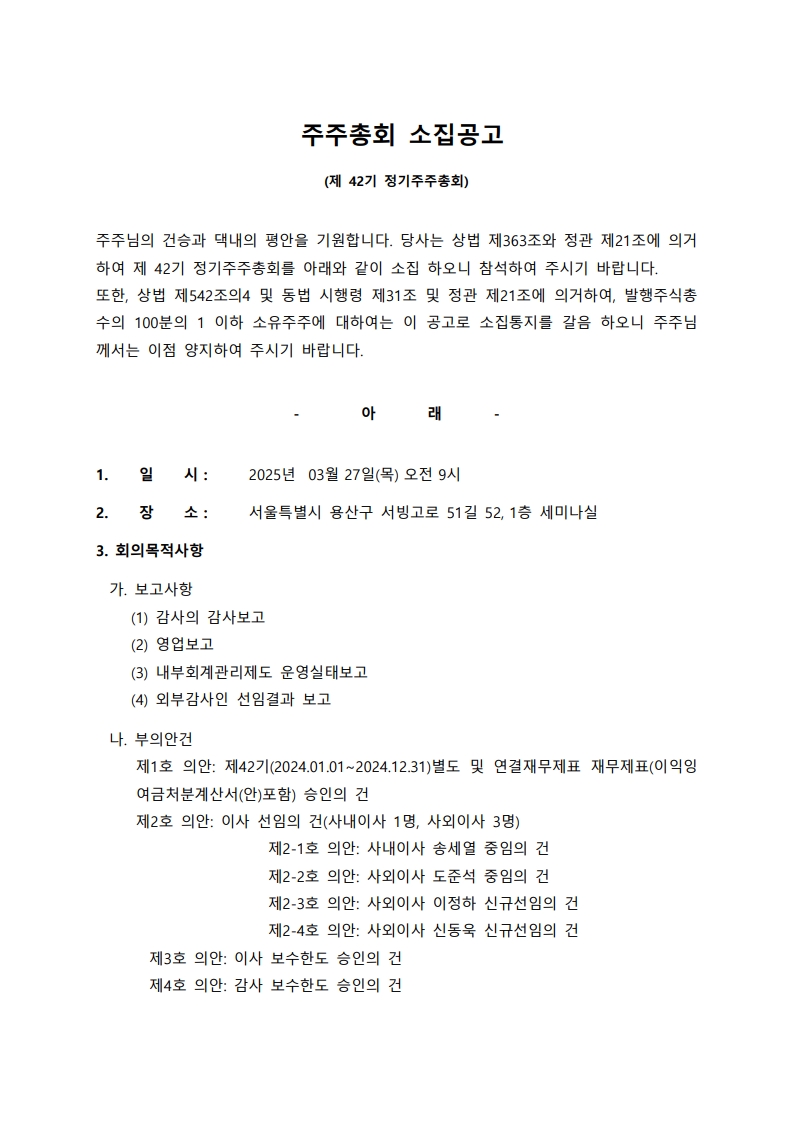 주식회사 디모아 제42기 정기주주총회 소집공고